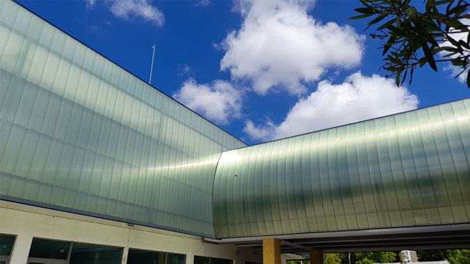 For the roof structure of the building (glazing part) LEXAN™ THERMOCLEAR™ 325X sheet was chosen. Next to the high impact strength, the product provides sun protection to reduce heating of the covered area and allows a comfort of use.