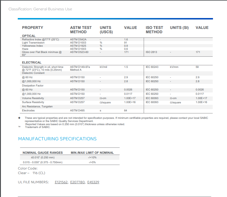 LEXAN FR60 Flame Retardant Film is a clear, thin polycarbonate film that is polished on both sides and is UL94 V-0 certified to meet the stringent requirements of a variety of electrical, electronic and transportation applications. LEXAN FR60 film is easily thermoformed, hydroformed, embossed, die-cut, folded and bent and is ideal for applications such as printed circuit board insulation, backlit aircraft in-flight panels and displays, commercial equipment insulation, computer rack dividers, and television and Monitor insulation.